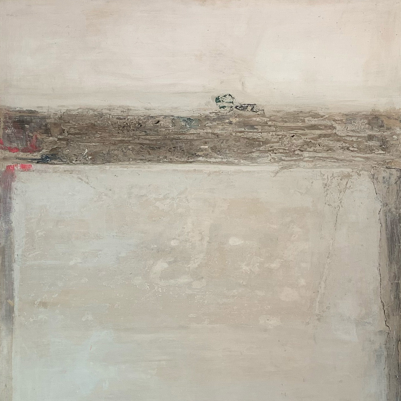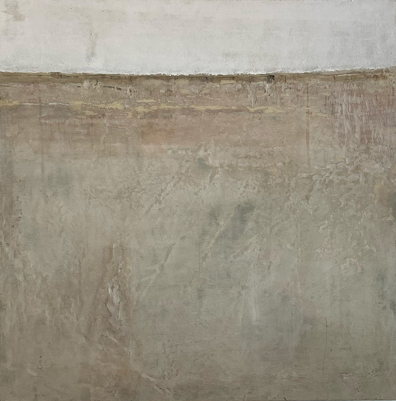 His process involves intentional physicality as well as dependency on the chemical activity of the inanimate materials at his disposal: in the studio, paintings are taking form all around him, with canvases spread out to receive drippage or catch spills from other works in progress; layers of medium form, and he wets them only to shave them down again, creating topographies and material stories on the canvas. He ultimately dictates the final foregrounded composition, focusing on subjects or environments that reflect humility toward the beautifully stark landscapes of the natural world, deference to the hardworking nature of the human experience, and other abstractions or figures in characteristically textured presentations. His work is recognized in not only its subjects, but also its identifiable ethereality, at once familiar and distant, hopeful yet forlorn.