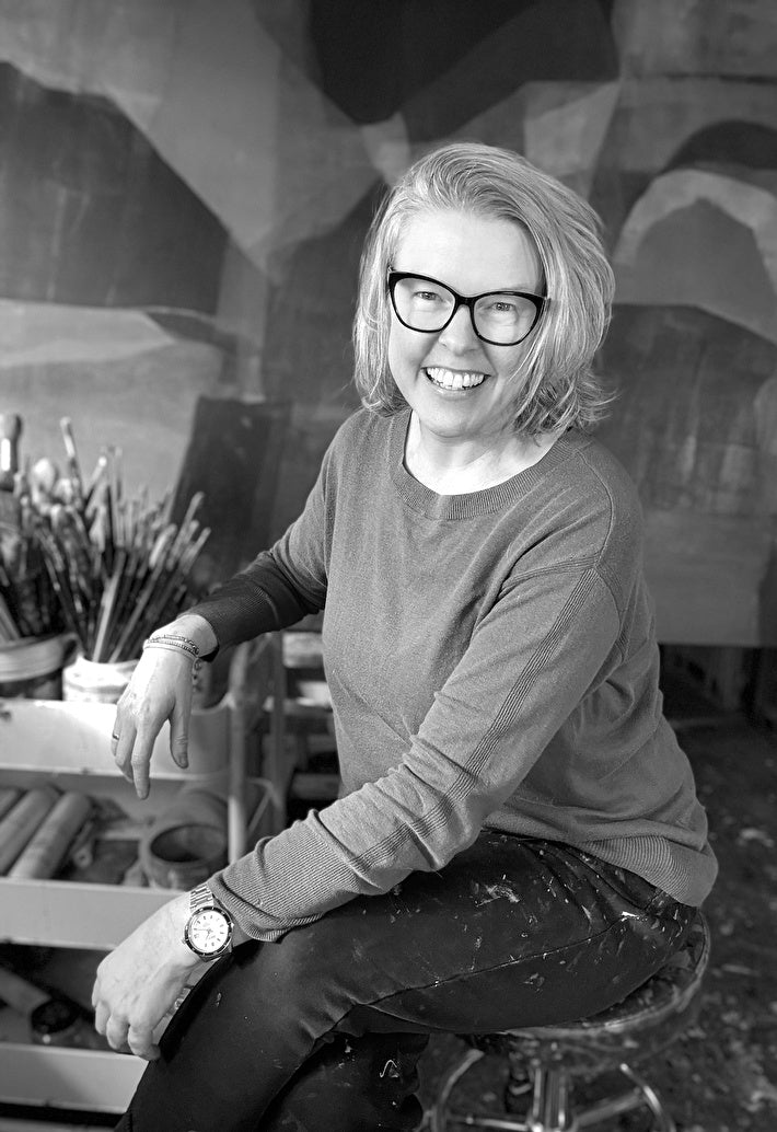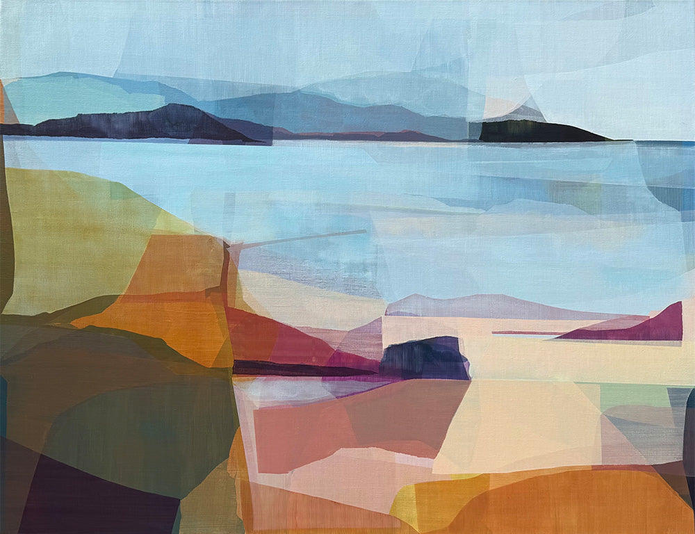 I was brought up on farms in rural South Australia and this has had an enormous influence on my studio practice. I am highly attuned to the seasons and climate, and pay close attention to the subtle patterns that nature creates, whether that be tidal lines along the shore or wispy clouds in the summer sky. The ebbs and flows of nature, its innate intelligence and striving for eco-system balance, is endlessly inspiring to me and informs my work in the ways I seek compositional balance, and the interconnectedness of elements through colour, shape and line. A regular visitor to my childhood homes of Kangaroo Island and Yorke Peninsula, these places bring a treasure trove of memories and emotions I draw upon in my abstracted imagery of undulating hills, paddocks, and still and moving bodies of water.