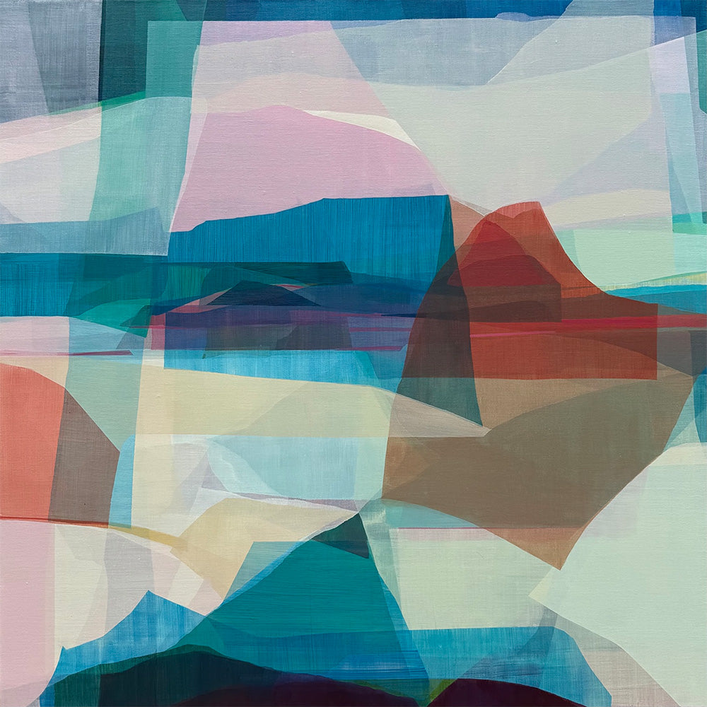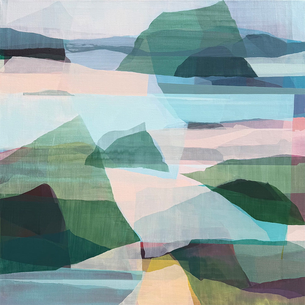Exploring ideas of play, chance, and risk-taking, I take an experimental and intuitive approach to my studio practice; rarely are paintings pre-planned. Rather, careful attention is paid to the process of painting itself with each additional mark, colour or shape informing the next move, until a conversation begins to form within the work with the overall aim to create a sense of ambiguity of place with multiple pathways through the work (and life). There is a call-and-response relationship that occurs with each artwork, where the painting begins to 'talk' to me, and I take a step back allowing the subconscious to guide the development.
